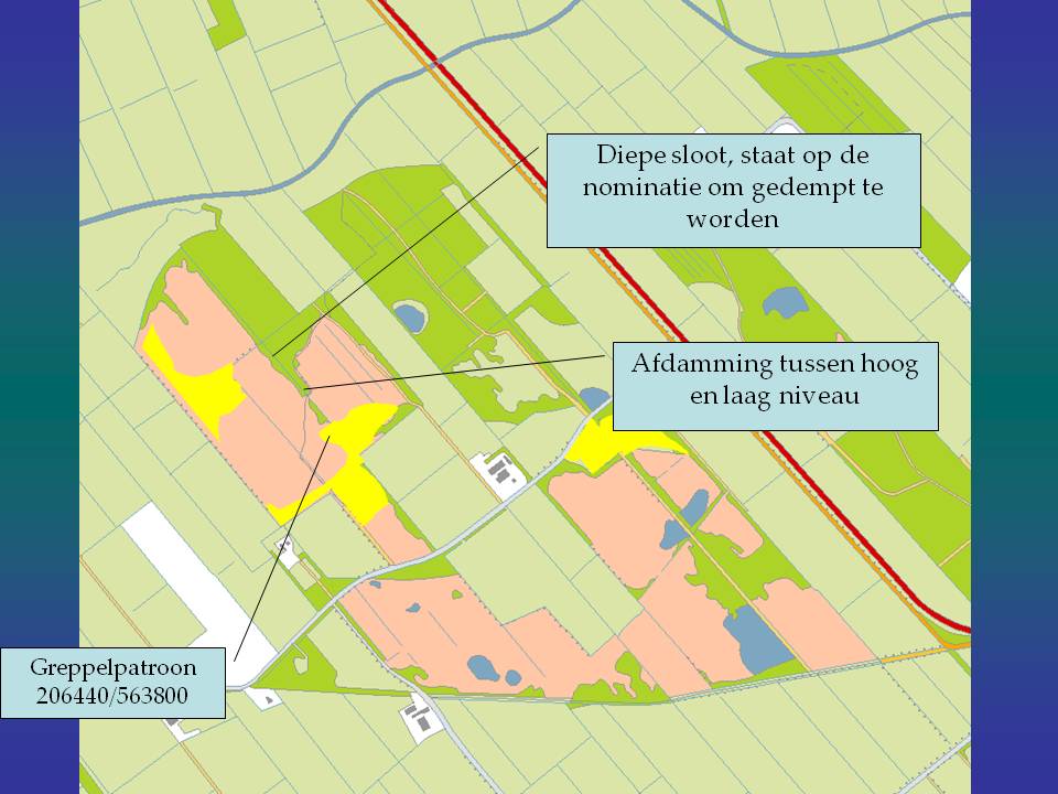 Greppels in blauwgrasland in combinatie met een diepe sloot die naar het noorden loopt, richting Koningsdiep